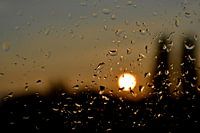 Zonsopgang achter een natte ruit met regendruppels na een zware regenbui in de vroege ochtend