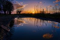 De ondergaande zon wordt gereflecteerd in een regenplas in een landweg. Aan de horizon zie je knotwilgen en een hek.