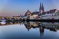 Uitzicht over de Donau naar de kathedraal van Regensburg en de stenen brug in Regensburg, Beieren, Duitsland, in de avond.