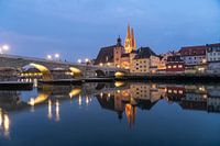 stadsgezicht met Donau, middeleeuws centrum, stenen brug en Regensburgse kathedraal in Regensburg bij schemering, Beieren, Duitsland, Europa