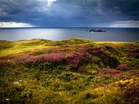 Landschapsfoto met uitzicht over de zee. Van het ene op het andere moment werd het donker en zagen we in de verte een grote regenwolk boven zee hangen. Door de zon die nog op de voorgrond schijnt is het een bijzondere foto geworden. Kleurrijk, sfeervol en uniek.