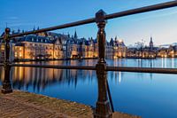 Foto - gemaakt vanuit een laag standpunt - van de regeringsgebouwen gespiegeld in de Hofvijver, Den Haag.