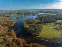 Hoge waterstand in de rivier de Regge in het Nederlandse Vechtdal in Overijssel, Nederland. De rivier stroomt over in de uiterwaarden na hevige regenval stroomopwaarts in Nederland en Duitsland tijdens de stormen Eunice en Franklin in februari 2022.