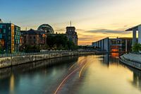 Het Berlijnse Rijksdaggebouw, zetel van de Duitse Bondsdag, bij zonsondergang.