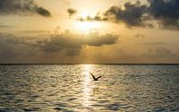 Een reiger vliegt boven de zee aan Zanzibar bij zonsondergang