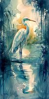 Het palet bestaat uit zachte blauwe en natuurlijke groentinten, vermengd met gouden en warme zonlichtaccenten, wat een rustgevende ochtendsfeer schept. De reiger, met zijn lange poten en statige nek, staat in het water en wordt geflankeerd door riet en weerspiegeld in het kalme oppervlak. Het kunstwerk speelt met de wazige grenzen tussen licht en schaduw, realiteit en reflectie, wat zorgt voor een dromerige, bijna etherische kwaliteit. De vage achtergrond van planten en bomen versterkt het gevoel van diepte en afzondering, terwijl de waterdruppels en verfspatten rondom de reiger de vrije en ongedwongen techniek van de kunstenaar benadrukken.
