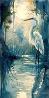 De reiger staat statig en alleen in het water, omringd door een weelderige moerasomgeving. De verf is op een zodanige manier aangebracht dat het water en de lucht naadloos in elkaar overvloeien, met reflecties die de sfeer…