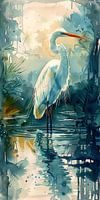 De reiger is met zorg geschilderd, waarbij de witte en blauwe veren subtiel overgaan in de omringende natuurlijke elementen. Het schilderij is gedomineerd door koele kleuren, variërend van zachte blauwtinten tot diepere schaduwen en accenten van goudgeel die de illusie van zonlicht door het gebladerte suggereren. De waterreflectie is kunstig uitgevoerd, met een bijna perfecte symmetrie die bijdraagt aan de kalme uitstraling van het werk.