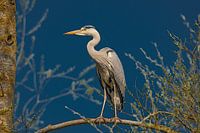 Reiger op een kromme tak in een klassieke pose met kromme hals op een gebogen tak naast een boom speurend naar voedsel en met een strak blauwe achtergrond.