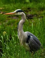 Foto van een reiger in het gras aan de sloot, zoekend naar vis