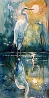 De weerspiegeling van de reiger in het water versterkt het gevoel van stilte en eenzaamheid in dit vreedzame tafereel. Al met al een Hip en stijlvol kunstwerk, waarmee je helemaal klaar bent voor dit jaar.