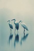 Een verstild moment vastgelegd in een dromerige compositie van drie statige reigers in ondiep water. De zacht-turquoise tonen en de perfecte spiegelreflecties creëren een sereen en meditatief beeld. De minimalistische benadering en de subtiele kleurschakeringen geven het werk een tijdloze, bijna Japans aandoende elegantie.