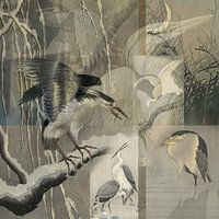 Reigers. Langs de waterkant op een tak of stilletjes in het water op 1 poot wachtend op een visje. Een prachtige verzameling 18e en 19e schilderijeren samengebracht als een totaal kunstwerk in beige teinten. Tevens in groene teinten verkrijgbaar.