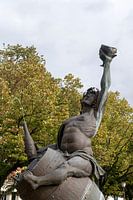 Reimich Luxembourg On the esplanade a Bacchanalian character spouting water revolves riding a barrel of wine. Reimich is in the Luxembourg wine region on the Route du Vin. fountain, bacchus, wine, water feature,