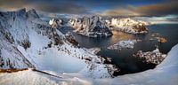 Uitzicht vanaf de top van Reinebringen op het dorp en de fjord van Reine in de besneeuwde winter, Lofoten
