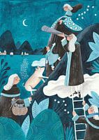 Een illustratie waar veel te zien is, een reis door de nacht. Wijze rechters ontdekken de sterren en moeder en kind worden herenigd. Mand met muizen en varken gaan ook mee. Dit alles in blauw tinten. Origineel acrylverf op papier.