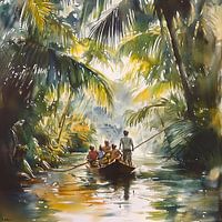 Een delicate houten kano glijdt door dichte, glinsterende palmbomen over het water, dat glinstert in zachte tinten van goud en groen. De silhouetten van de passagiers passen harmonieus in de mystieke sfeer, terwijl het licht door de bladeren danst en de mysterieuze jungle tot leven brengt. Een moment van stilte, vol avontuur en…