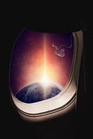 Je ziet een astronaut in de ruimte vanuit een vliegtuigraam en op de achtergrond zijn gekleurde sterren en een planeet.