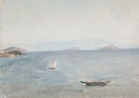 Zeezicht op gebergte onderweg naar Constantinopel uit 1893. In zachte blauw vergrijsde tinten. Met bootjes op zee.