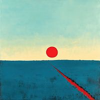 "Reis naar de Horizon" is een minimalistische verkenning van ruimte, afstand en de mysterieuze aantrekkingskracht van het onbekende. Een levendige rode zon zweeft aan de verre horizon, waarbij de intense kleur scherp contrasteert met het uitgestrekte blauwe landschap dat oneindig naar de zon toeloopt. Een eenzame rode lijn snijdt door de voorgrond en leidt de blik van de toeschouwer rechtstreeks naar de zon, wat een pad of reis naar een onvermijdelijke bestemming symboliseert. De eenvoud en strengheid van de compositie roepen een gevoel van kalmte, contemplatie en de eeuwige zoektocht naar betekenis op.