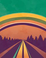 Een oneindige weg naar de horizon: Dit landschap, geïnspireerd door de kleurrijke esthetiek van de jaren 1960, brengt een vrolijke en nostalgische sfeer naar elke ruimte. De rechte straat, omgeven door gestileerde bomen, leidt je oog naar een expressieve zonsondergang in abstracte tinten van groen, geel, oranje en paars. Aquareltexturen…