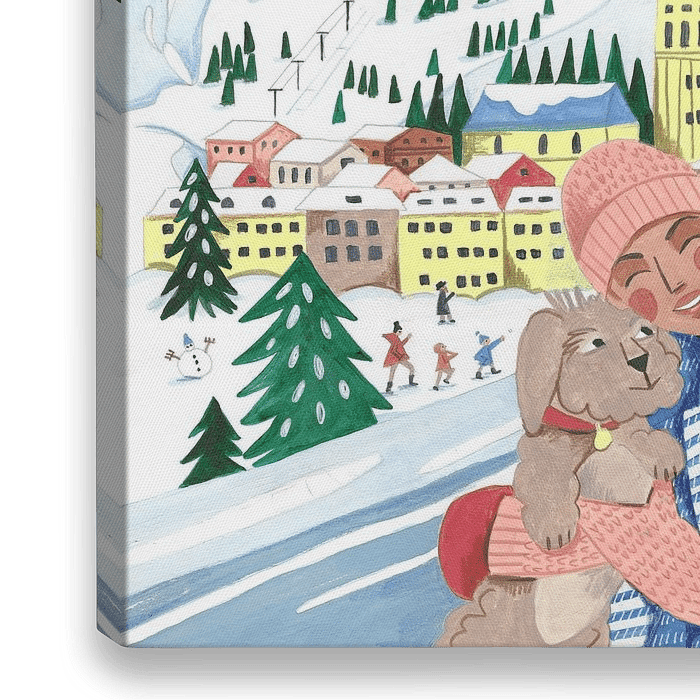 Een reisposter met een vrouw die met haar hond in een skioord in Italië, Cortina. Ze heeft een mooi fel rood jack met een blauw gestreepte sjaal. Ze draagt een muts met bijpassende handschoenen en heeft mooie donkere haren. In de achtergrond zie je het ski dorp en de kerk in het skiresort. De bergen en de bomen ontbreken natuurlijk ook…