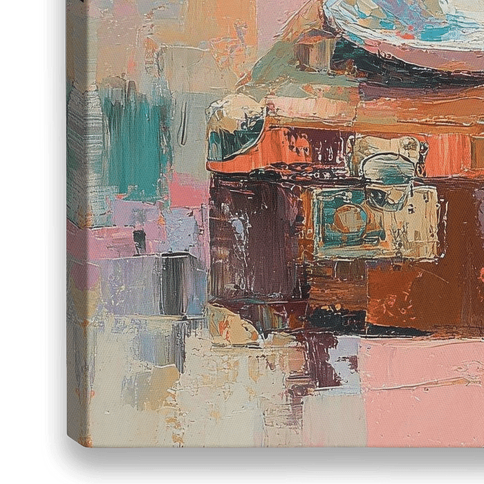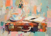 Dit impressionistische schilderij toont een donkere houten koffer waarop een open, wit notitieboekje met een zwarte pen ligt. Ernaast staat een wit koffiekopje op een schoteltje, gevuld met lichtgekleurde koffie, en een vaasje met groene bladeren. De achtergrond bestaat uit verticale, losse penseelstreken in oranje, roze, blauw en wit,…