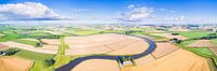 Een panorama luchtfoto (3x1 verhouding) van het meanderende Reitdiep door de akkers van de provincie Groningen. De foto is genomen met een drone vanaf Aduarderzijl in Noordwestelijke richting met het dorpje Ezinge links in beeld.