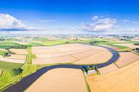 Een drone luchtfoto van het meanderende Reitdiep door de akkers van de provincie Groningen. De foto is genomen vanaf Aduarderzijl in Noordwestelijke richting met het dorpje Ezinge links in beeld.