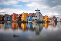 Gekleurde huizen aan het water Reitdiephaven. Moderne architectuur in Groningen