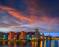 Een 4:5 foto van een knallende zonsondergang boven Reitdiephaven, een moderne woonwijk in de stad Groningen.