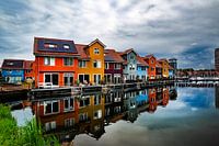 Reitdiephaven Groningen,huizen aan het water met reflectie en mooie wolkenlucht eind september 2024