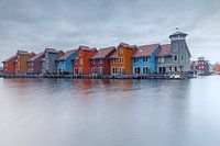 De bekende gekleurde huizen die aan de Reitdiephaven staan. Gemaakt met een lange sluitertijd waardoor er beweging in de wolken en water komt.