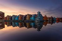 Deze foto toont de iconische en kleurrijke huizenrij van Reitdiephaven in Groningen, perfect weerspiegeld in het stille water tijdens het blauwe uur, vlak na zonsondergang De zachte gloed van de ondergaande zon kleurt de lucht in pasteltonen, wat een prachtig contrast vormt met de heldere gevels van de woningen. De architectuur doet denken aan Scandinavische havenstadjes en zorgt samen met het water voor een levendig en toch sereen tafereel.