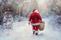 In een betoverd winterbos, gehuld in zachte sneeuwvlokken, dwaalt een bekende figuur in felrood rond. Zijn grote, gevulde zak belooft vreugde en verrassingen, terwijl de ijzige stilte de magie van de komende feestdagen omhult. Een vleugje nostalgie en verwachting zweeft door de lucht terwijl hij naar zijn mysterieuze bestemming loopt.