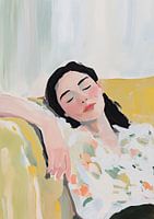 Een portret van een Aziatische vrouw met gesloten ogen, liggend op een bank in een witte pyjama en bloemen, met lichtgele muren, in de stijl van Henri Matisse. Minimalistische compositie, zachte penseelstreken, zachte kleuren en een eenvoudige achtergrond. De penseelstreken zijn los en uit de vrije hand, met een minimalistische stijl…