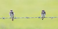 Twee jonge oeverzwaluwtjes op een prikkeldraad in een groen weiland.