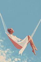 Een illustratie in retro-stijl van een ontspannen moment in een hangmat tegen een helderblauwe lucht. De minimalistisch weergegeven figuur in een witte jurk lijkt te zweven tussen hemel en aarde, wat een gevoel van vrijheid en zorgeloosheid uitstraalt. De zachte kleurtinten en vloeiende lijnen creëren een dromerige sfeer die doet verlangen naar warme zomerdagen.