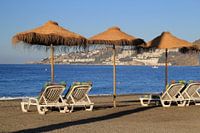 Enele rieten parasollen met strandstoelen op een strand in Almuñecar, Spanje met op de achtergrond de zee.