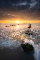De zon breekt onder de wolken door tijdens deze zonsondergang aan de Zeeuwse kust, waar het zeewater de golfbreker overspoelt.