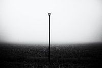 Religie, lantaarnpaal en landschap in de mist, zwart-wit met grove filmkorrel en groot contrast