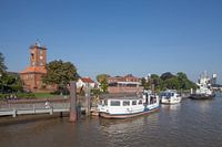 Stadskern met aanlegsteiger aan de Weser, Brake, district Wesermarsch, Nedersaksen, Duitsland