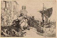 Rembrandt van Rijn (Nederlands, 1606-1669), Het schip van Fortuin, 1633, ets. Van wat Rembrandt echt was, weten we maar weinig, behalve door zijn schilderijen, zijn etsen, zijn tekeningen. Zijn extreme absorptie in het werk, dat tijdens zijn goede dagen een geluk en in zijn slechte dagen een opluchting was, scheidde hem als een grote arbeider, die weinig bekend was met de mannen van zijn dag, op zo'n manier, althans zoals we redelijkerwijs verwacht hadden . Nu kennen we al de gewone feiten van zijn leven, de legendes zijn weggesmolten, en we kunnen jaar na jaar de stilzwijgende uitvoering van zijn enorme taken volgen. Wat de make-believe romantiek is verdwenen, is de echte Rembrandt nog steeds een poëtisch karakter uit de eenvoud van zijn leven, en het gevoel dat we van een interieur hebben die zijn werk vervult en alleen bekend is. Zijn roem is jaar voor jaar zo groot dat hij in het wereldverhaal een groot deel van de waarde van dat inheemse land vertegenwoordigt, die hem niet begreep. Niemand is in Holland geweest, maar heeft het belang van zijn naam gevoeld, en zijn geheugen doordringt de steden waarin hij wat obscurely werkte. Rembrandt is geboren te Leiden, aan een rijk van de Rijn, wiens naam zijn vader had genomen, en waaruit hij zijn volledige naam van Rembrandt van Rijn krijgt. De naam van zijn vader was Harmen. Vandaar zijn andere naam Harmensz.