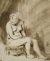 De meid zit naakt op een lage stoel in dit naaktportret, waardoor haar benen, heup, buik en torso met borsten ontbloot op het portret staan.