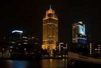 Rembrandttoren aan het Amstelplein in Amsterdam. Gefotografeerd vanaf de Amstelrivier in de avond.