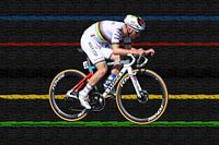 Voor de 2de maal rijd de wereldkampioen op de weg, Remco Evenepoel met een witte koersbroek. Zoals eerder ook Poalo Bettini en Tom Boonen dit ook deden voor de wolfpack. Hij won er Luik Bastenaken Luik mee. En nu dus ook het nationale kampioenschap op de weg in Izegem. Het derde pak is al besteld voor de Ronde van Lombardije. Dit is dan ook een unieke foto van Remco in zijn tocht naar de driekleur.