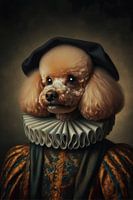 Dit is een digitaal beeld van een poedel met een renaissance kostuum. Het beeld voelt schilderachtig aan. De poedel hond is licht van kleur.
