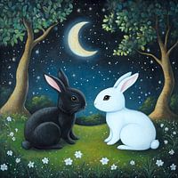 Twee konijnen, een zwart en een wit, zitten op een grasveld onder een maansikkel en een sterrenhemel. Bomen omlijsten het tafereel en versterken de betoverende sfeer.