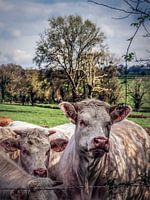 Witte Charolais runderen, koeien, die nieuwsgierig over het prikkeldraad staren