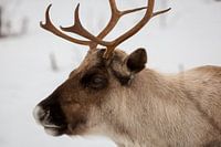 Een Noors rendier met gewei in de sneeuw, vlakbij Tromsø, Noorwegen.
